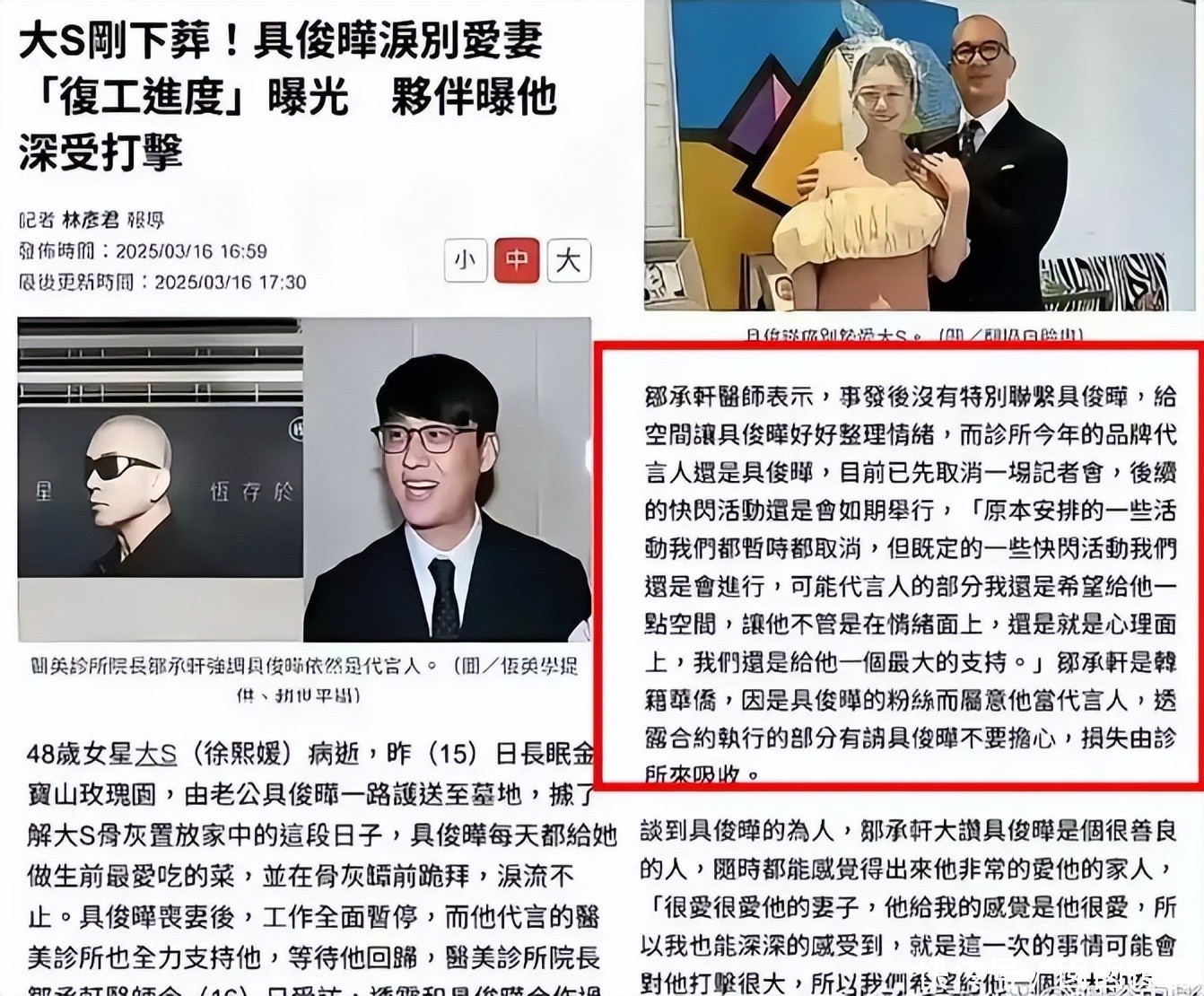 葛斯皆更在直播中爆料:“大S埋葬时风雨杂乱,连老天都在为她抽咽,可具俊晔的心想显着不在吊唁上。”