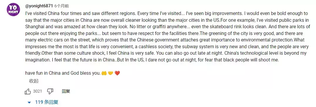 3)还有来过中国上海的好意思国东谈主说,他来过四次中国,每次齐能看到中国的当先和变化,他在上海的公园看到中国相称干净,莫得各式垃圾和涂鸦,而且连滑板场看起来齐很干净,城市内部好多电动汽车在行驶,总计城市相称便捷,一经是无现款社会,同期中国很安全,在好意思国他晚上不太敢外出,因为怕黑东谈主理枪枪击他.....