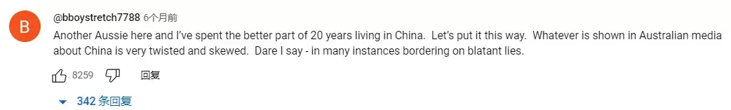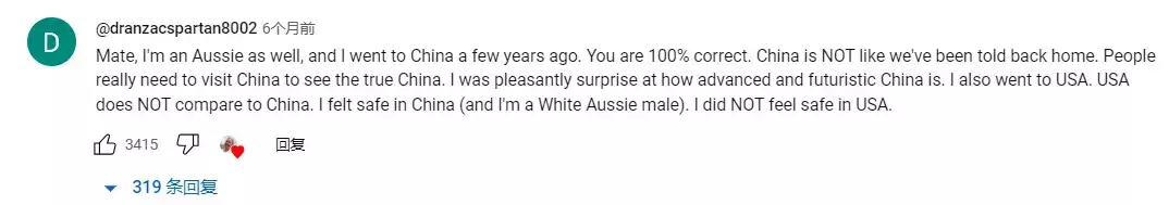 3:视频批驳区时常会有不少来过中国的番邦东谈主发批驳说中国绝对和西方媒体宣传的不相同,西方媒体上对于中国的信息好多,但基本齐是负面信息。