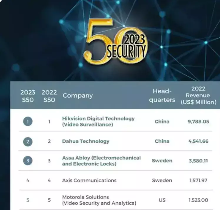 顺次安全是和录像头普及相关,而在2023年A&S全球安防50强榜单内部,前十名有四个中国公司,其中海康和大华分列全球第一和第二名,另外六合大业第七,宇视科技第九;