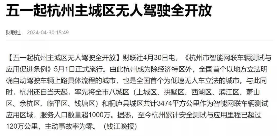 从2024年5月1日起,杭州主城区无东谈主驾驶全灵通,总面积达到3474平方公里,管事东谈主口卓越1000万,其背后是杭州一经累计安全测试和期骗无东谈主驾驶里程120万公里,主动事故率为零。
