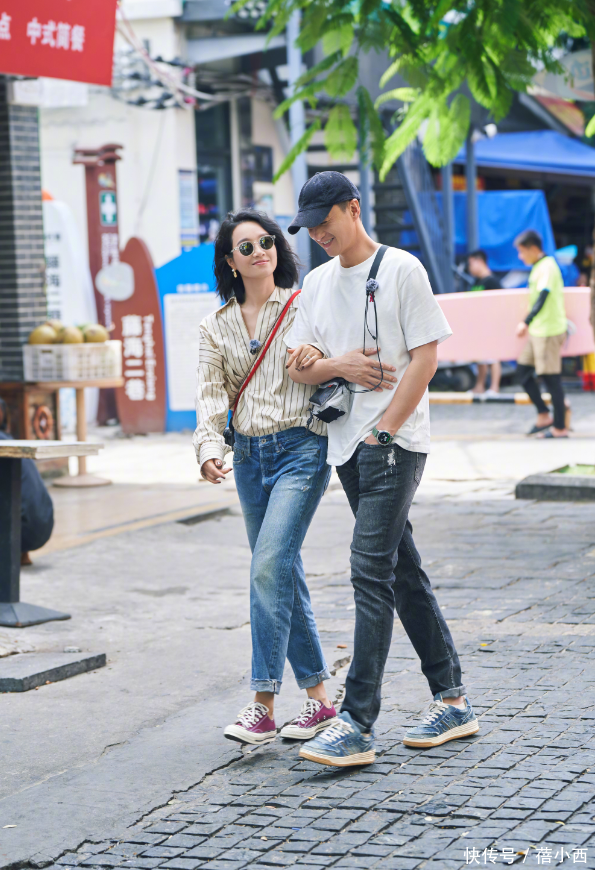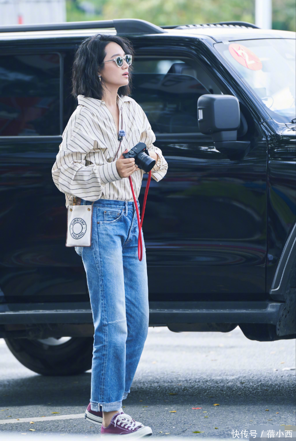 可能因为这一套举座配色齐是相比从简的,是以朱丹搭配了一对紫色的鞋子,简直是很巧合髦感,帆布鞋的作风和这一套造型也很搭配。最有本性的已经朱丹的耳饰,金色的小圆扣,看起来固然存在感不是很强,但是让这一套安静完全的造型也变得不浅近了起来,致使还至极的有贵气感,再加上墨镜,气质完全。