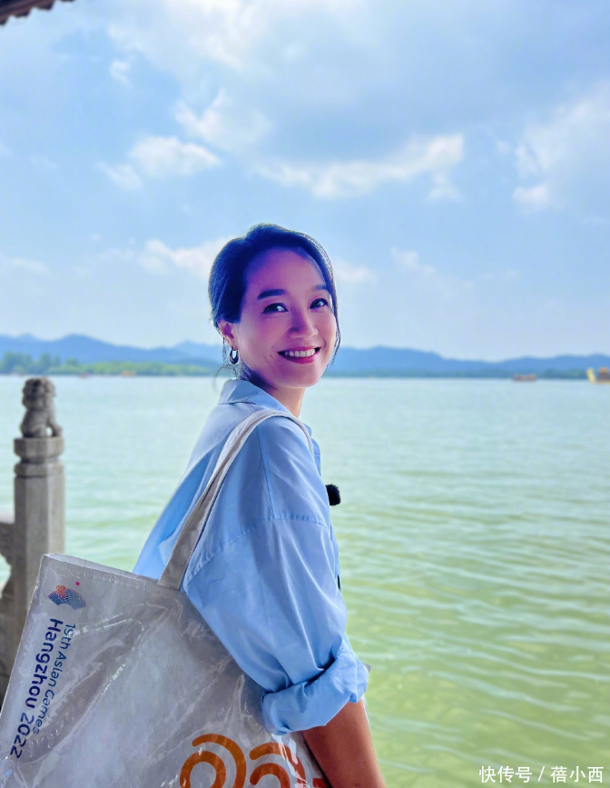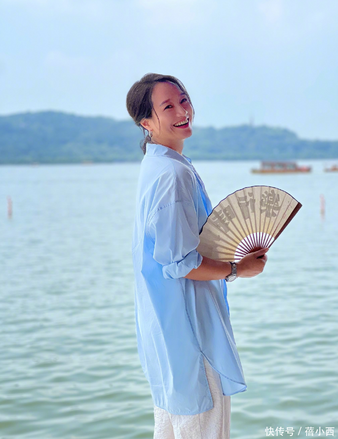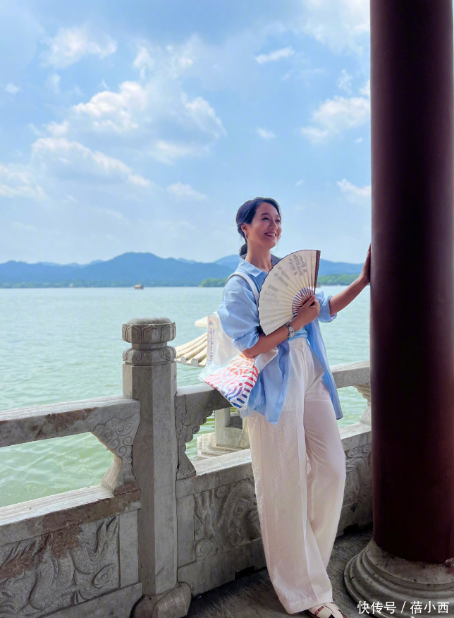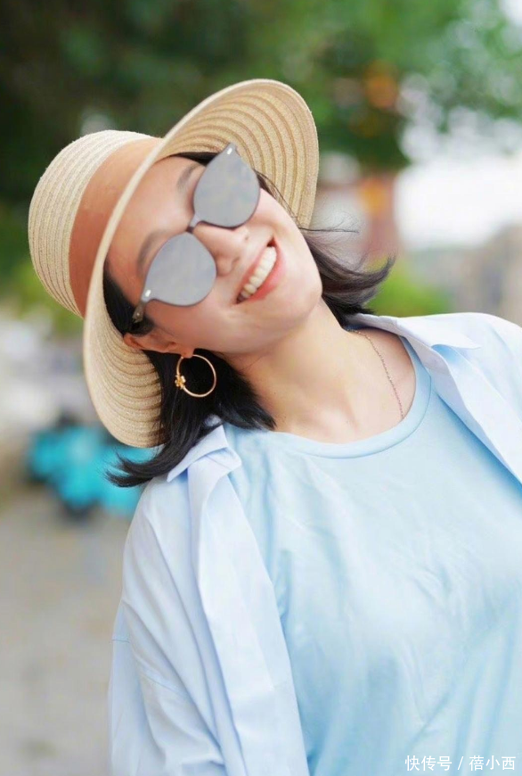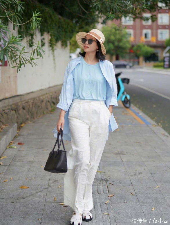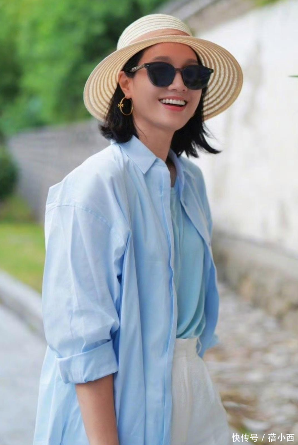 浅蓝色的雪纺衬衫,有一种大海的簇新感,穿在身上固然并不显白,然而却胜在文艺气味完全。不外从图片里已经可以看出来,朱丹内搭的蓝色雪纺衬衫其实是有些显黑的,因为举座色系偏亮。