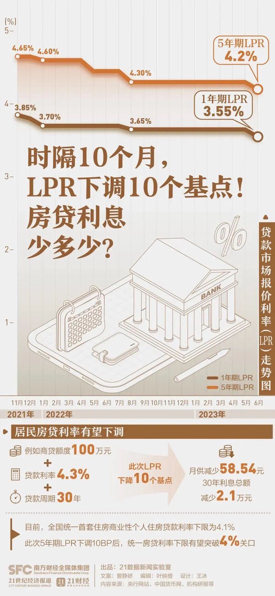 6月20日,据央行网站音讯,最新一期贷款市集报价利率(LPR)出炉,五年期LPR下调至4.2%,此前为4.3%。